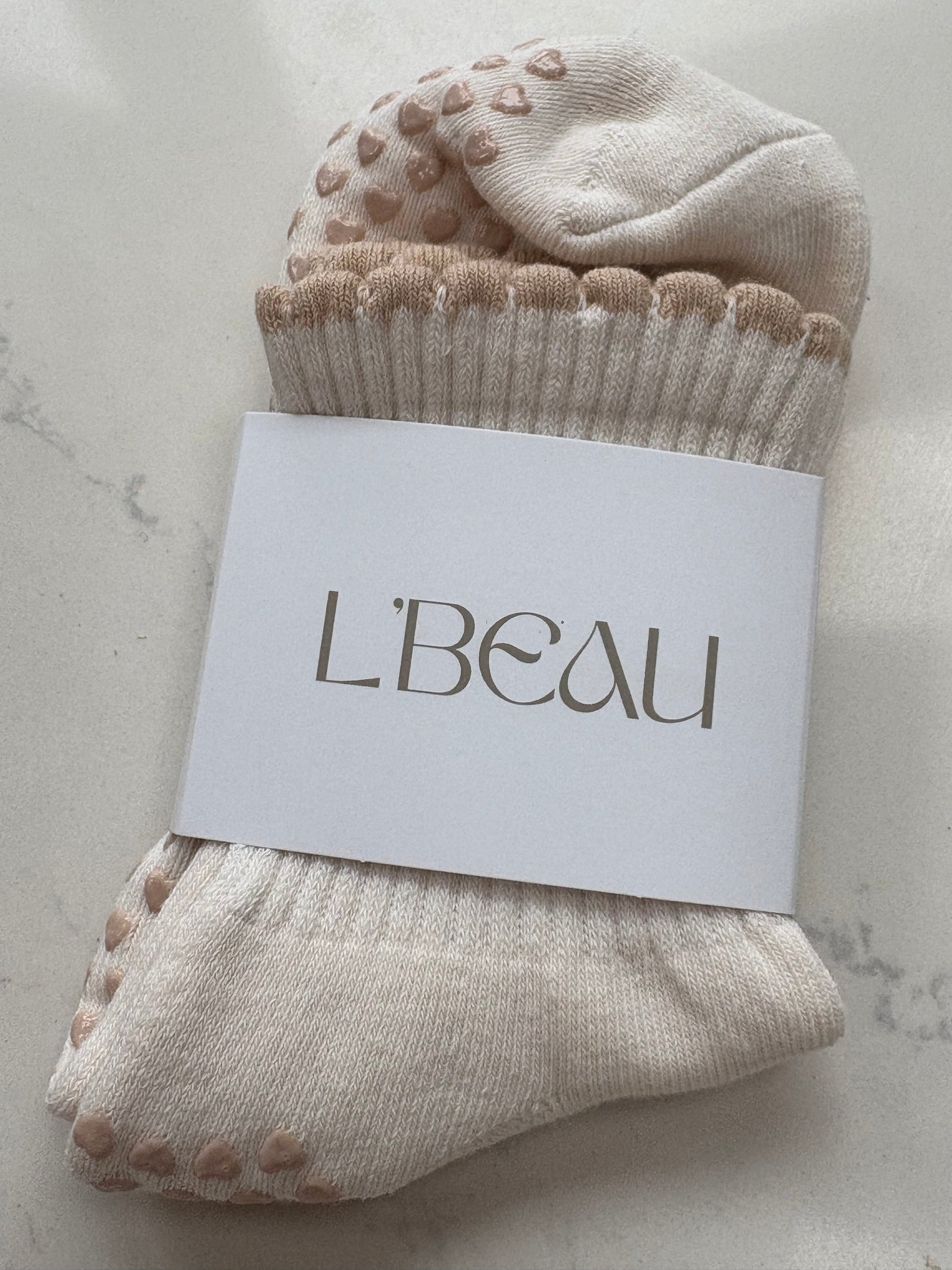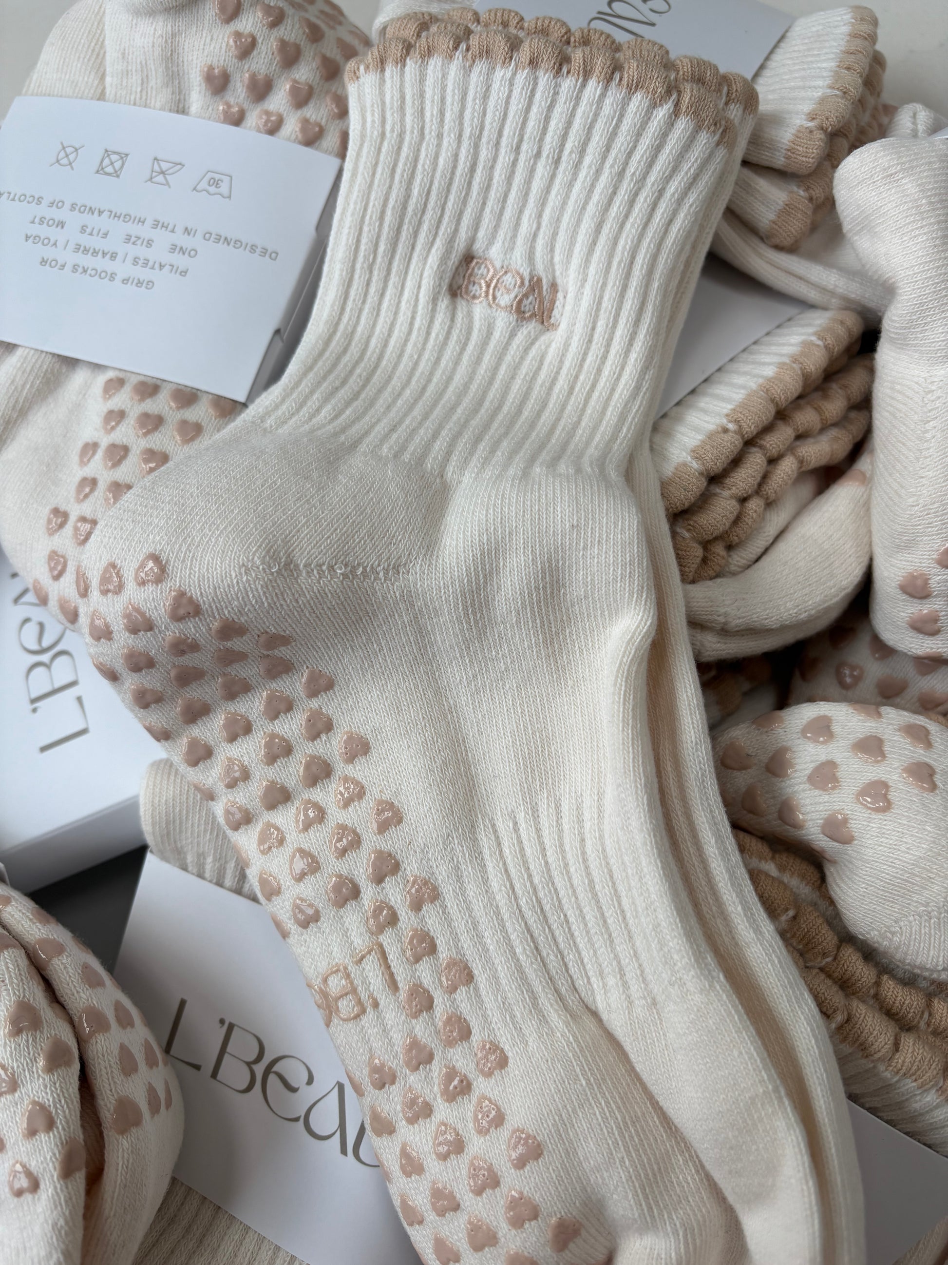 Cream and Taupe Heart grip socks with bubble hem and embroidered logo